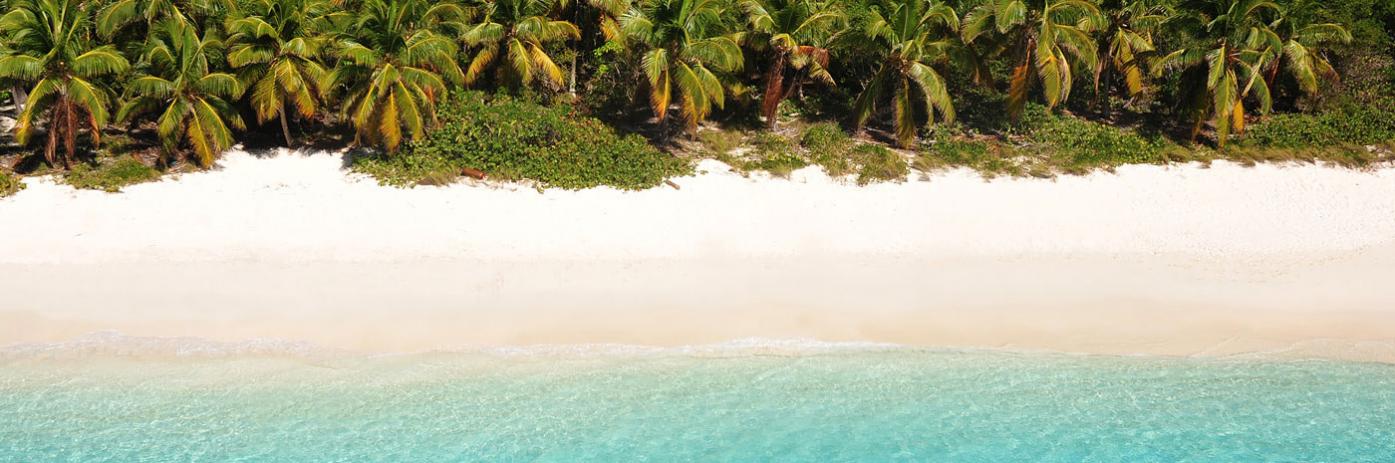 Lush green trees line the coast of deep blue water under a blue sky.