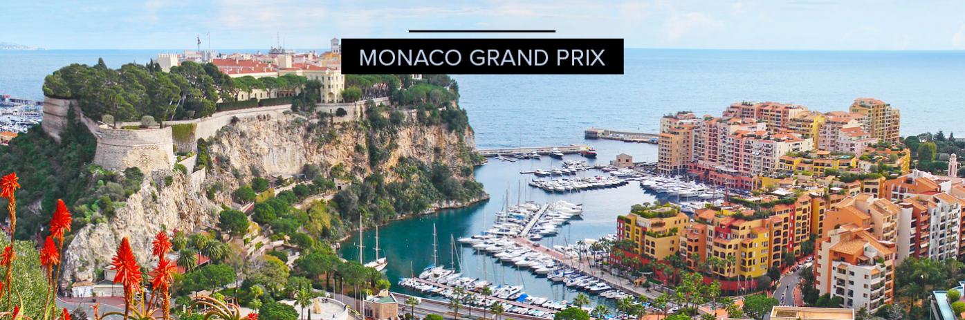 A view from above, of the colorful city of Monte Carlo and water, with the title 'Monaco Grand Prix'.