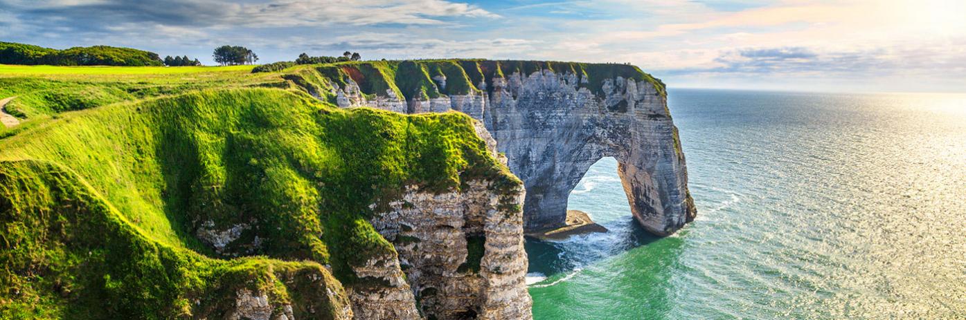 Cliffs covered in vibrant green vegetation overlooking the blue water.