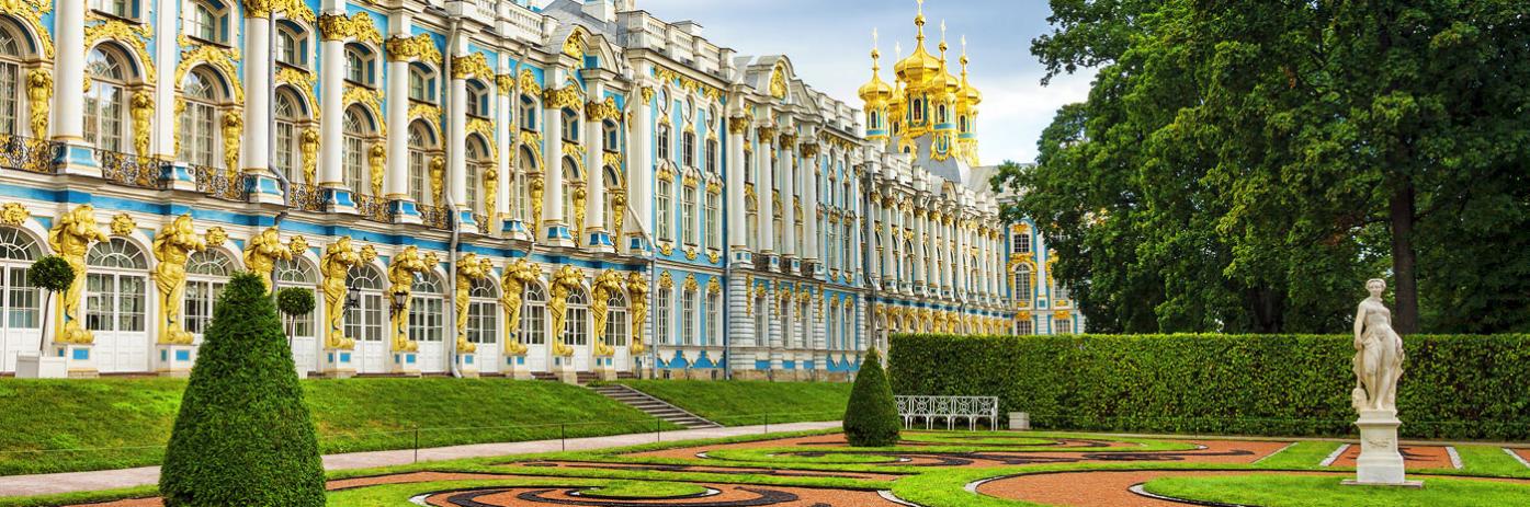 The rich gold accents of Russian architecture framed by vibrant trees.