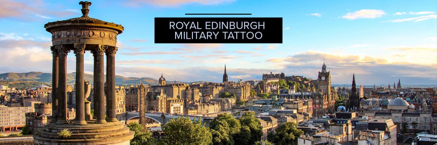 A birds-eye view of ancient architecture and a busy city, labeled 'Royal Edinburgh Military Tattoo'