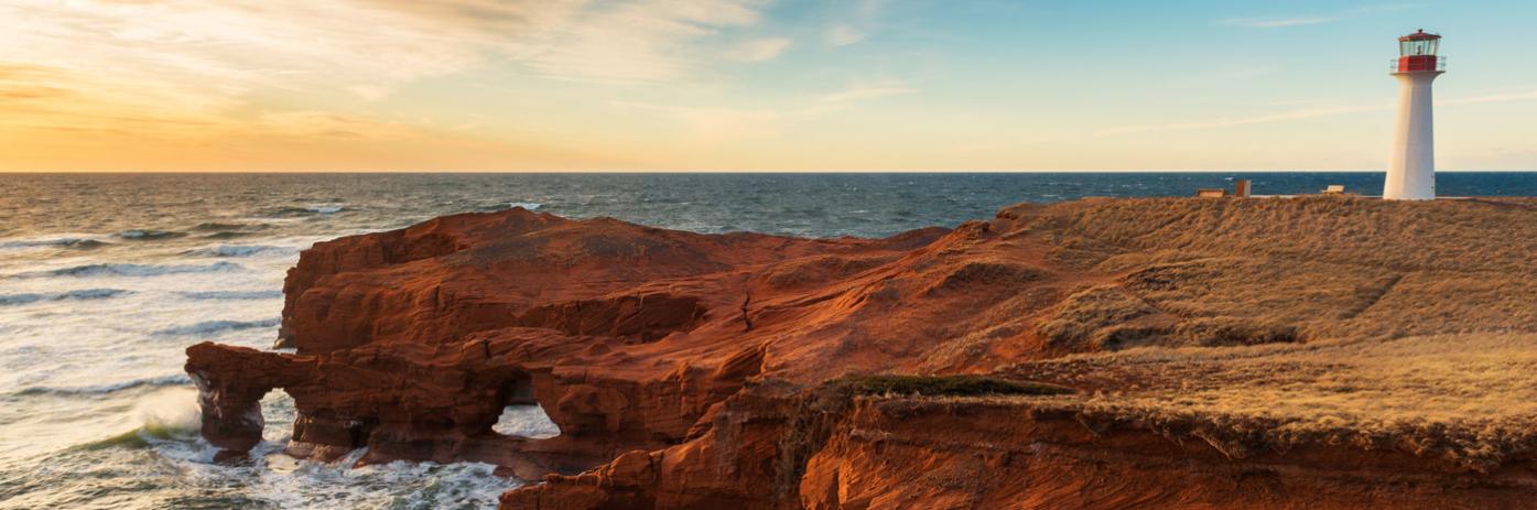 A lighthouse stands atop a rocky cliff, with crashing waves below and a picturesque sunset above.