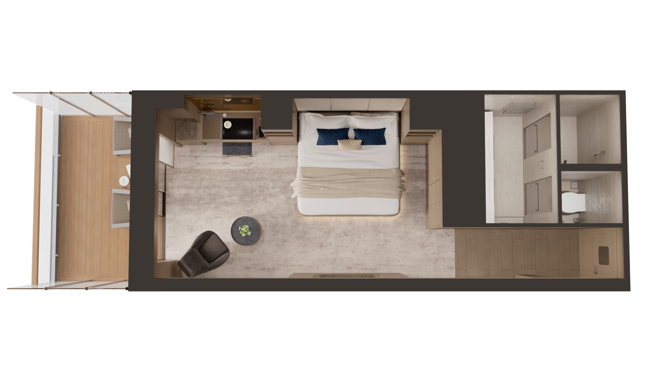An image of the terrace suite includes a private outdoor terrace that overlooks the ocean. Inside the suite is a sitting area with two chairs, adjacent to the bed. The suite also includes a full bathroom with separate vanity, shower and toilet areas.