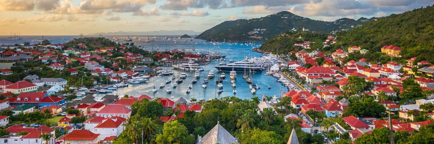 Red roofed houses in a waterside town under a sky of bright clouds.