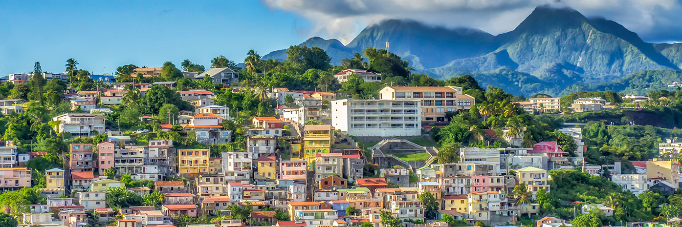 A colorful hillside town with mountains and clouds in the background.