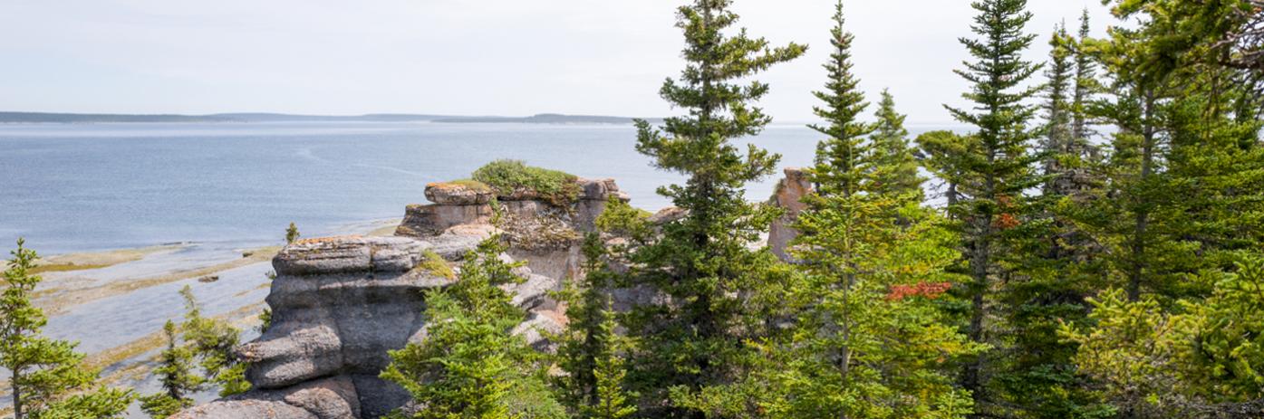Green trees in rocky cliffs overlooking the ocean.