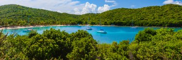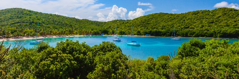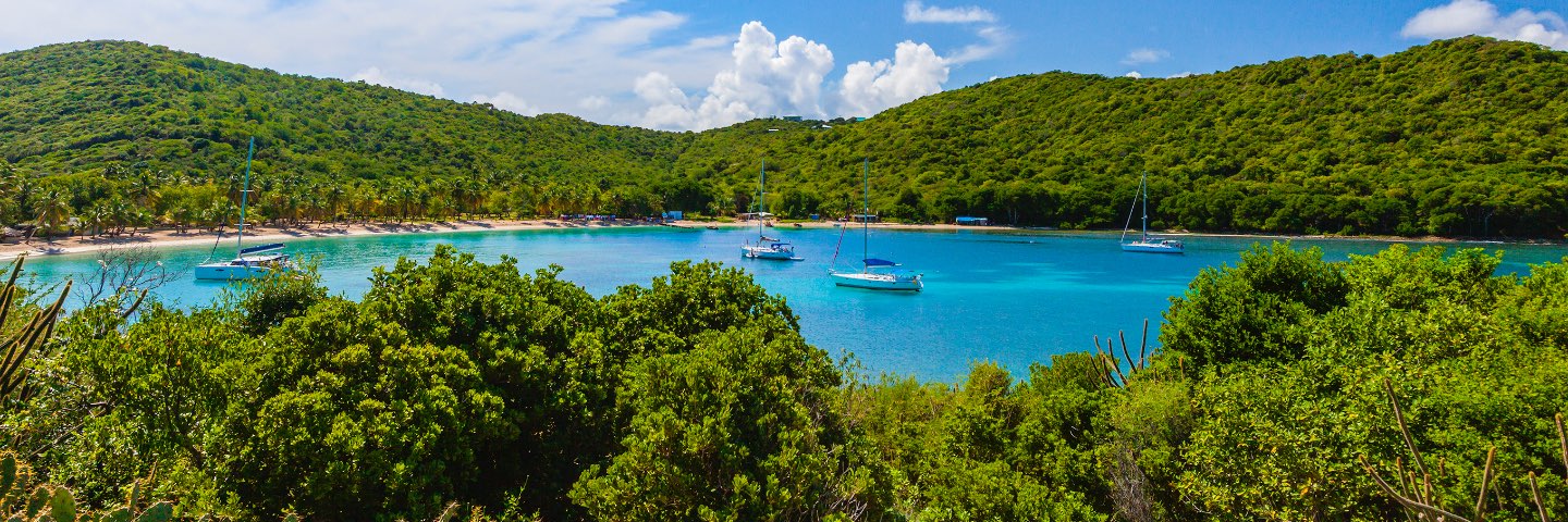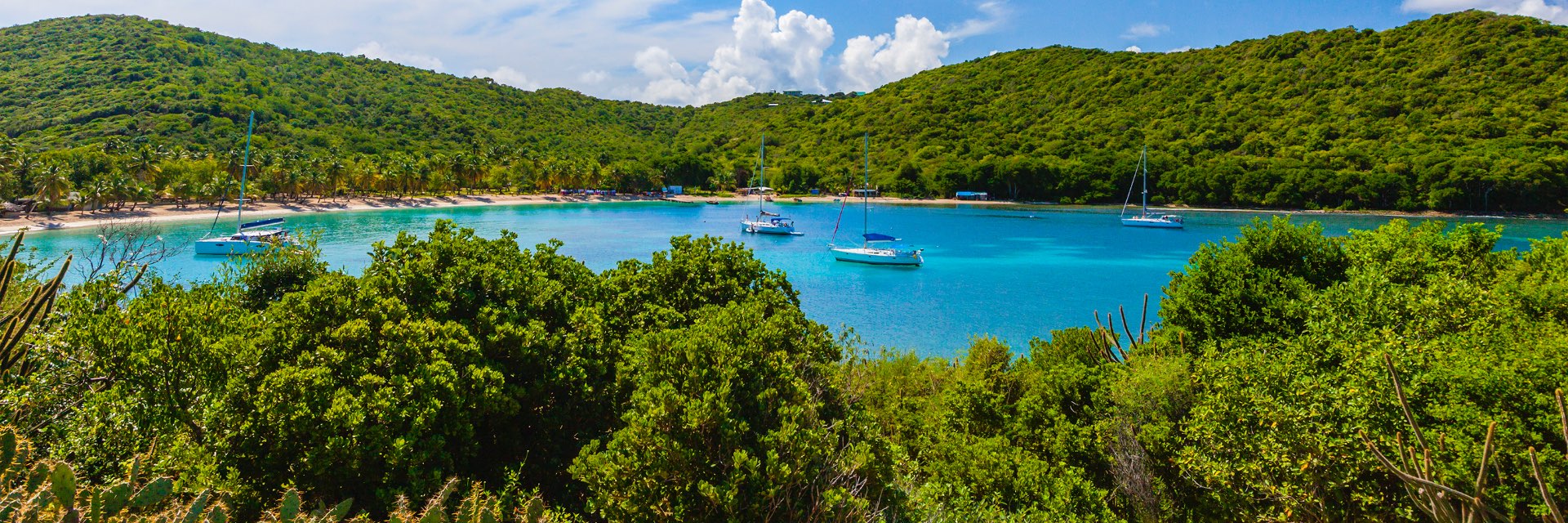 A fleet of sailboats sits on the bright blue water off the shore of a private beach.