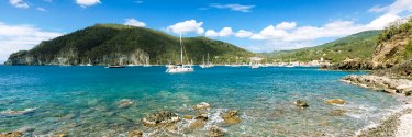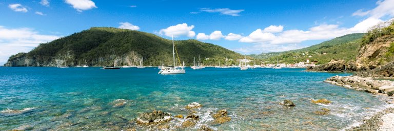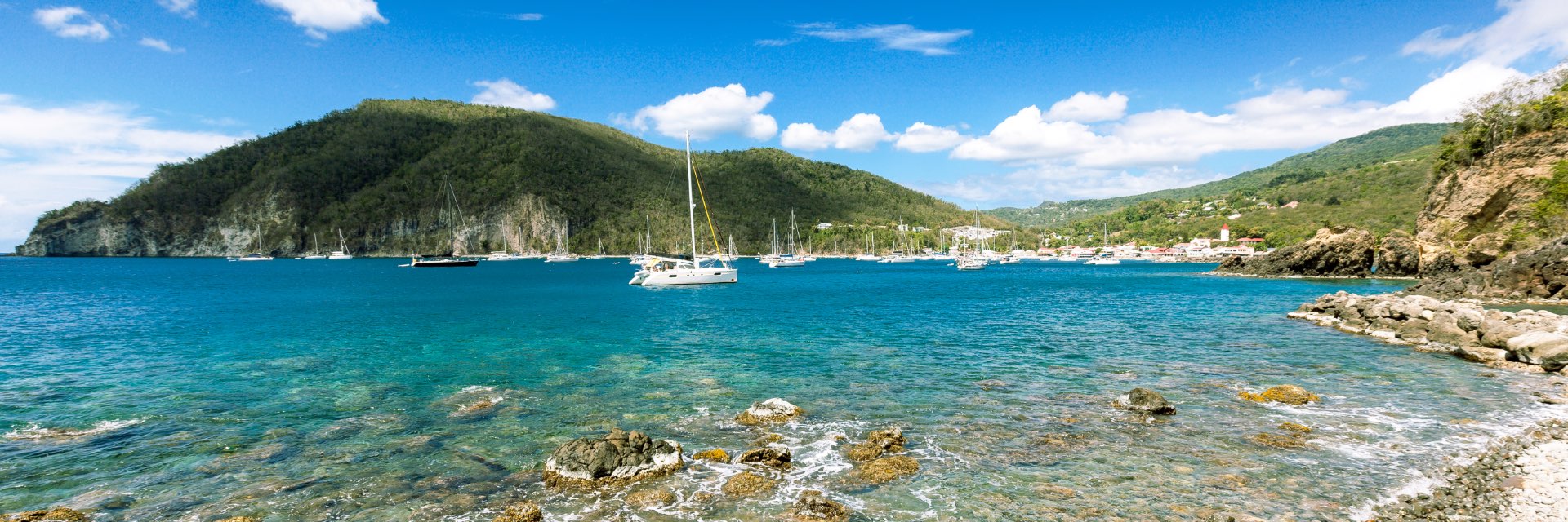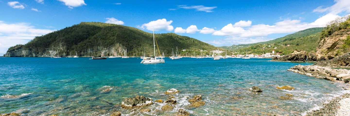 Sailboats float atop clear blue water yards off a rocky beach, a beach-side valley town lies in the distance.