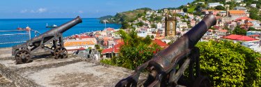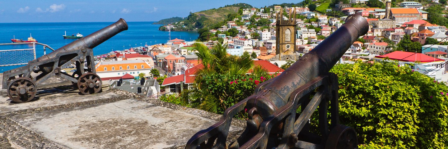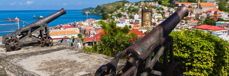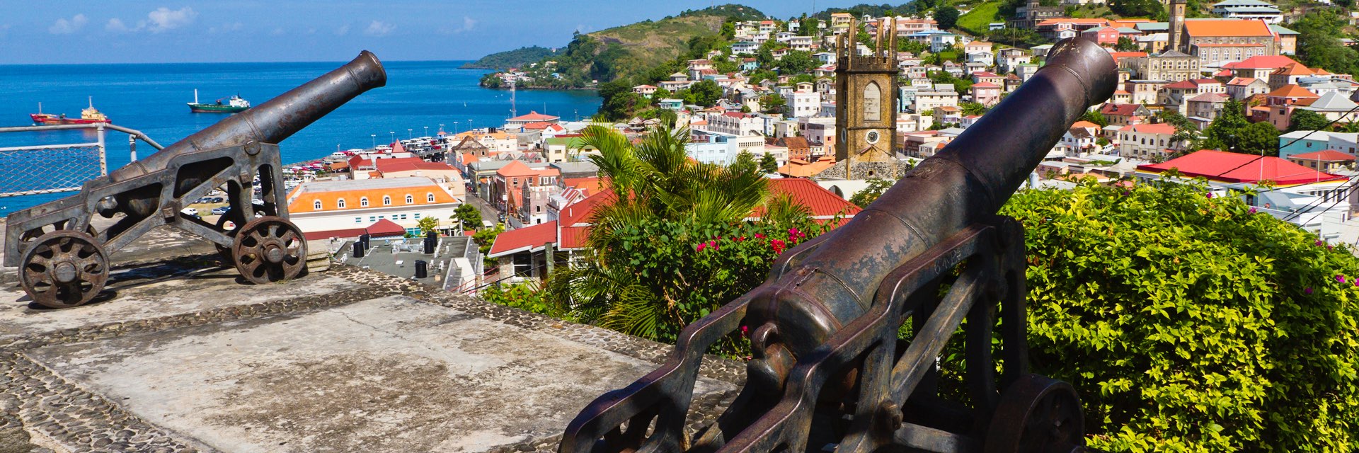 Two cannons lay perched atop a fort overlooking a colorful beachside town.
