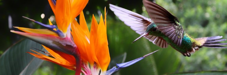 A hummingbird lands on a bird of paradise flower in Charlotteville, Tobago