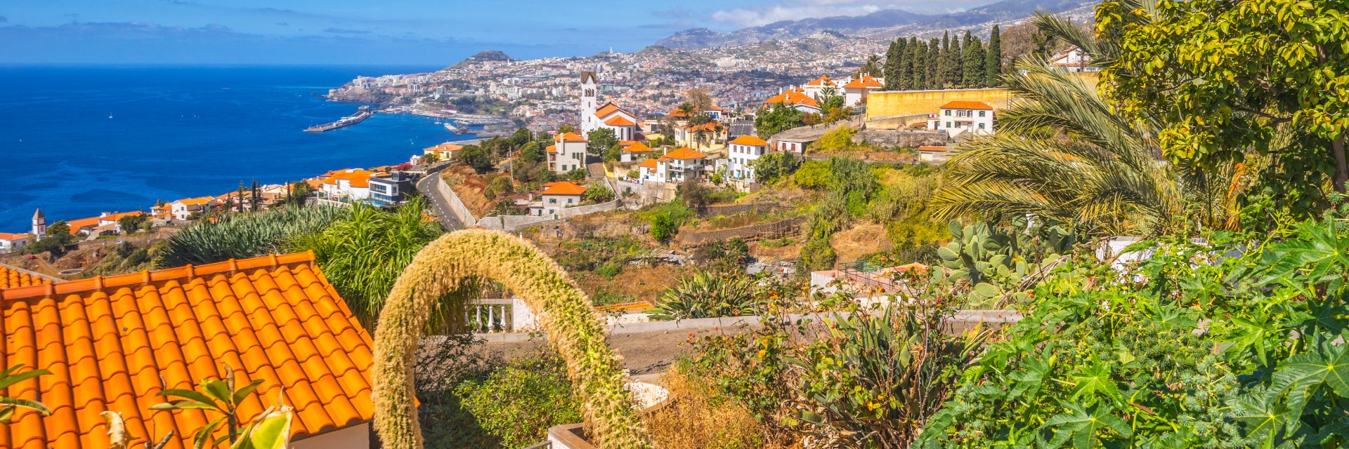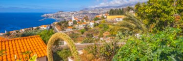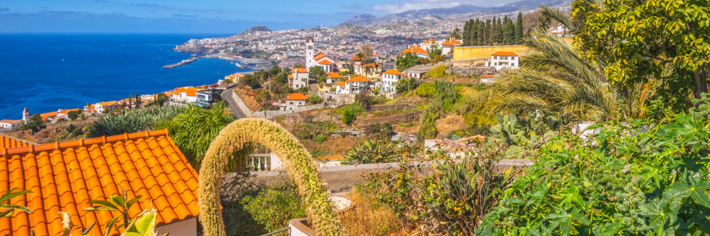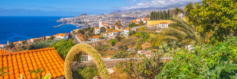 Brightly colored homes sit in between lush greenery and bright blue water.