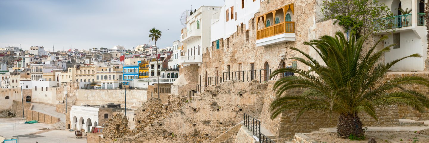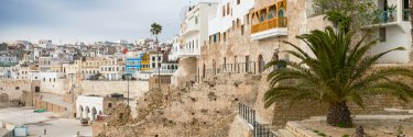Light brown stone buildings sit along the outskirts of a bustling Mediterranean town.
