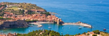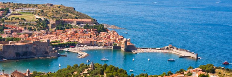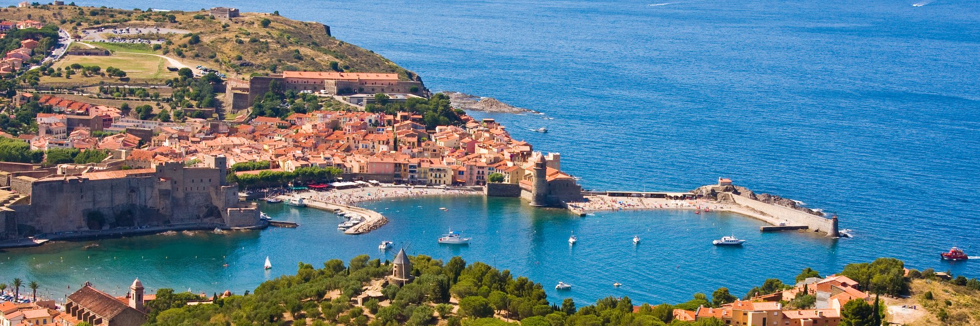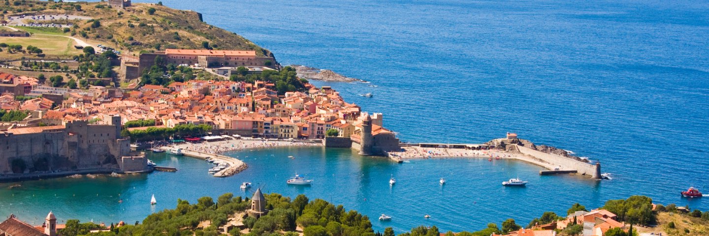 Red clay-roofed homes lead to a bustling beach town on bright blue waters.