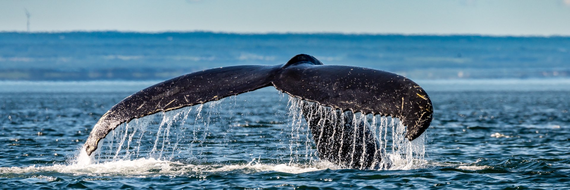 Humpback whale exhibiting its tail in river on sunny day.
