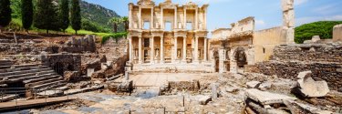 Ancient Roman ruins surrounded by lush green background with Cypress trees.
