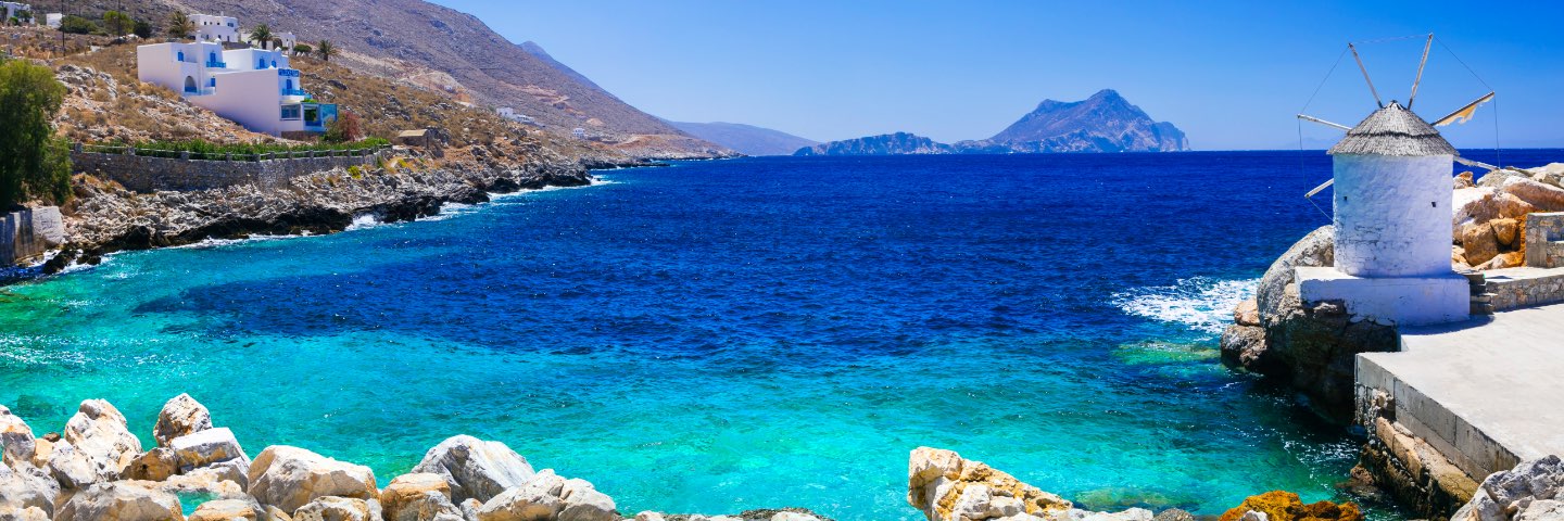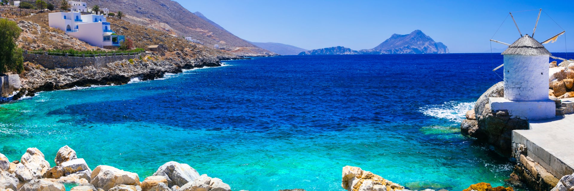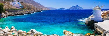 A single windmill faces royal blue water crashing up along the rocky Greek coast.