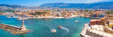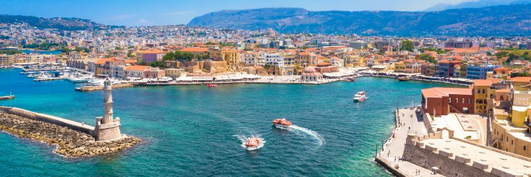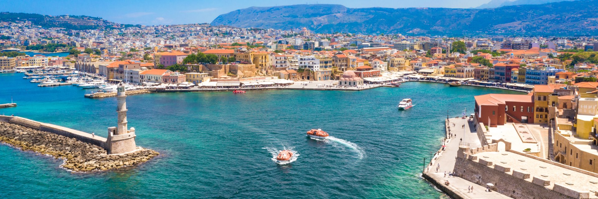 Ferry boats make their way into and out of the port along a colorful, sunny town.