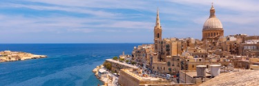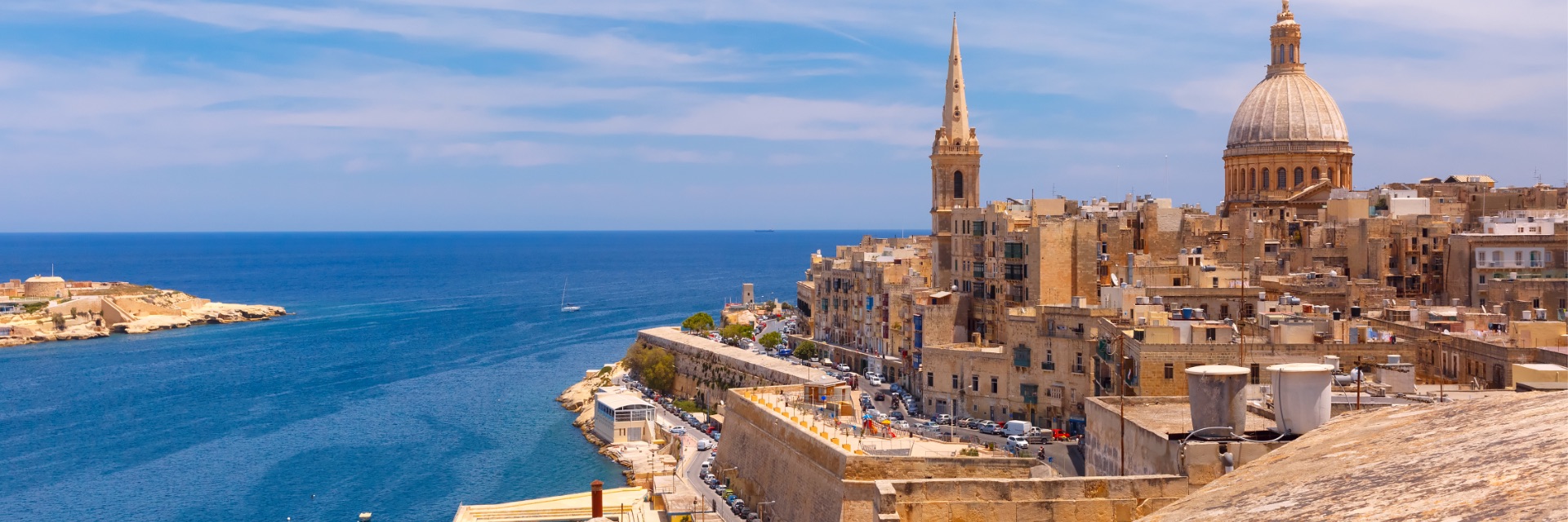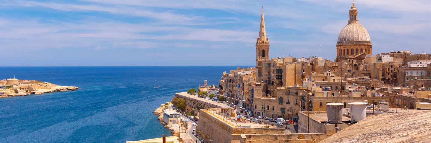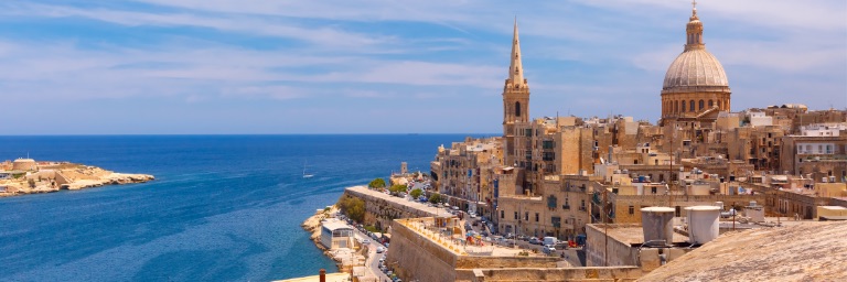 Dark blue waters lie still, surrounding an old city.