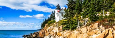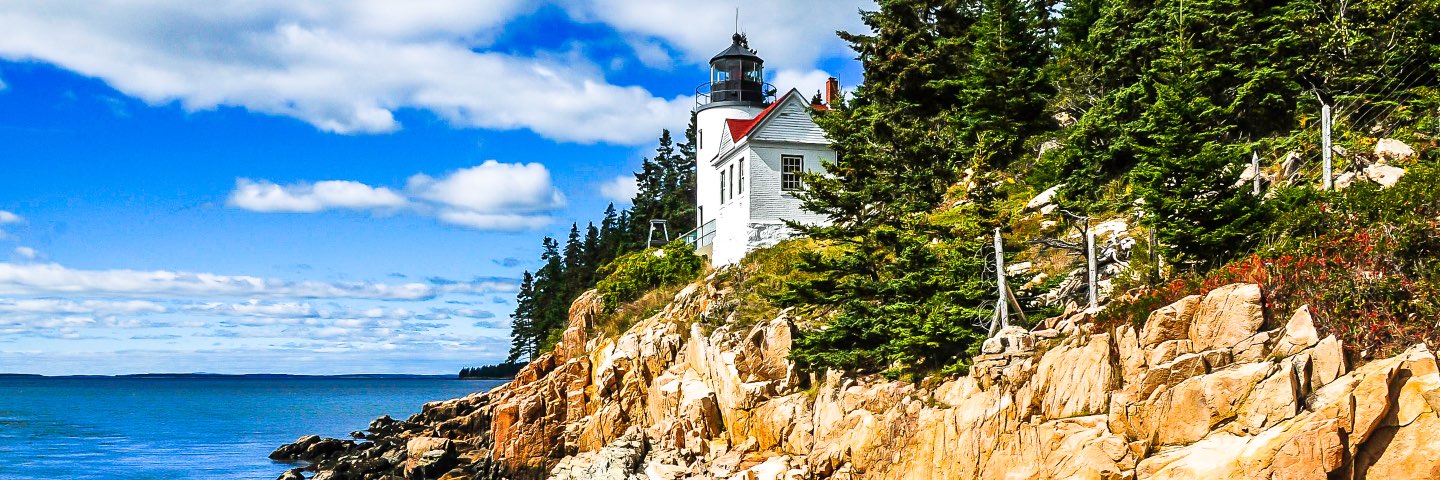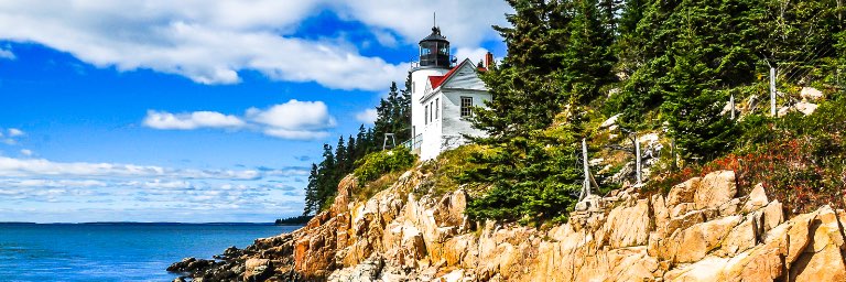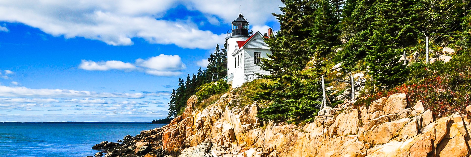 A light house atop a rocky cliff overlooks still blue waters.