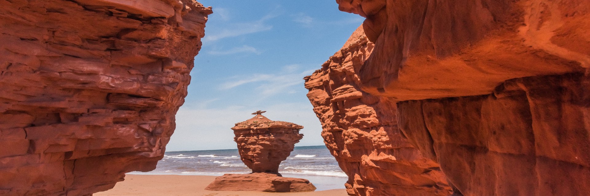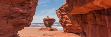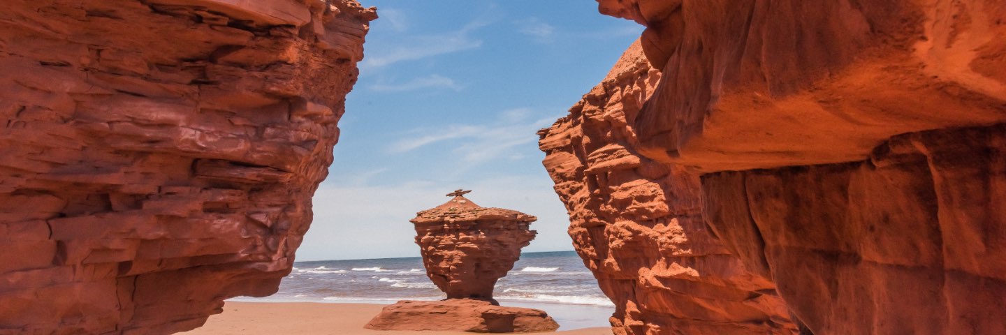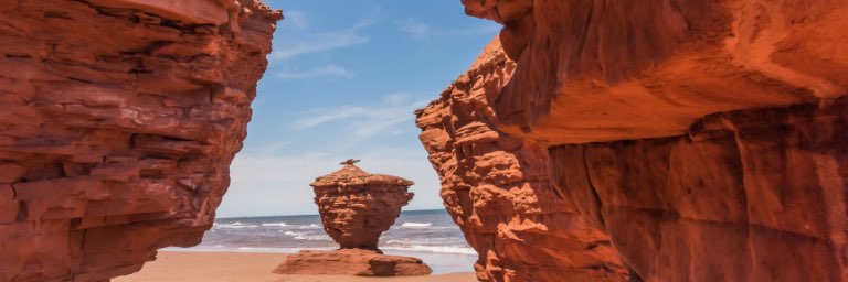 3 rock structures sit along a gold sand beach.