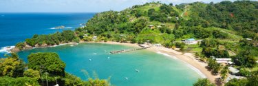 Turquoise waters wash up onto the beach in front of a vegetation filled town.