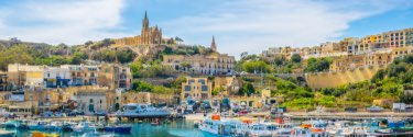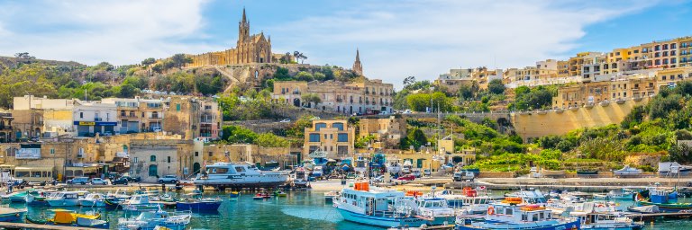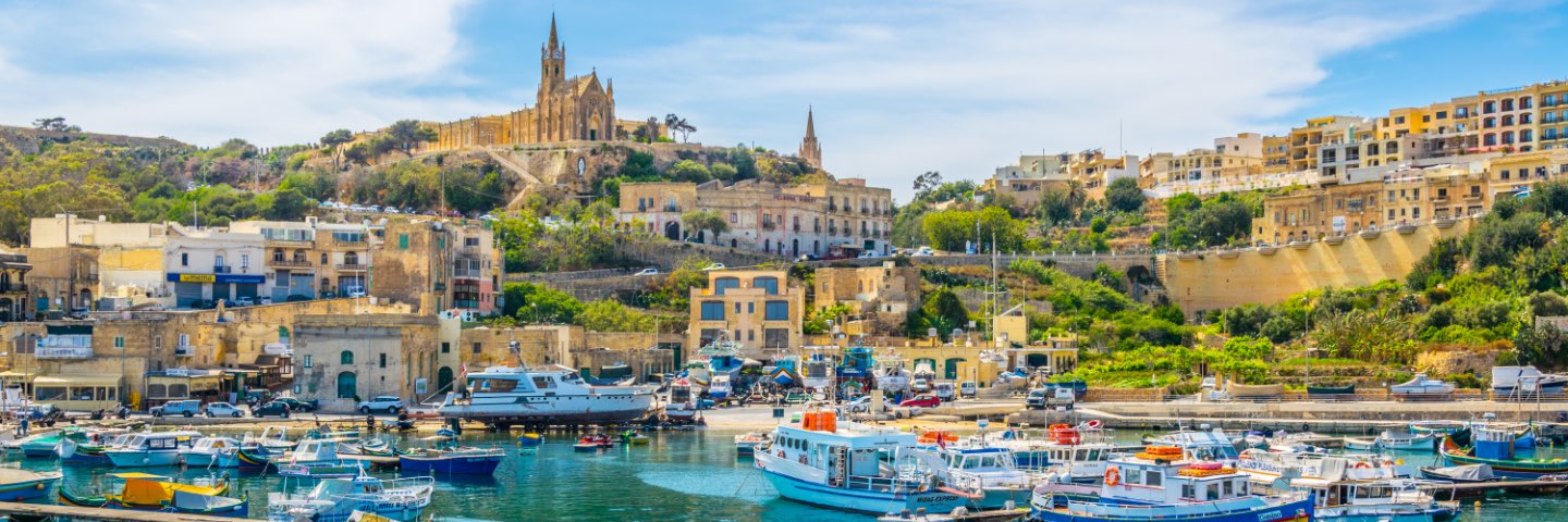 Marina with small boats and village and large cathedral in background.