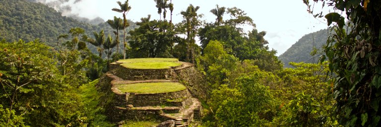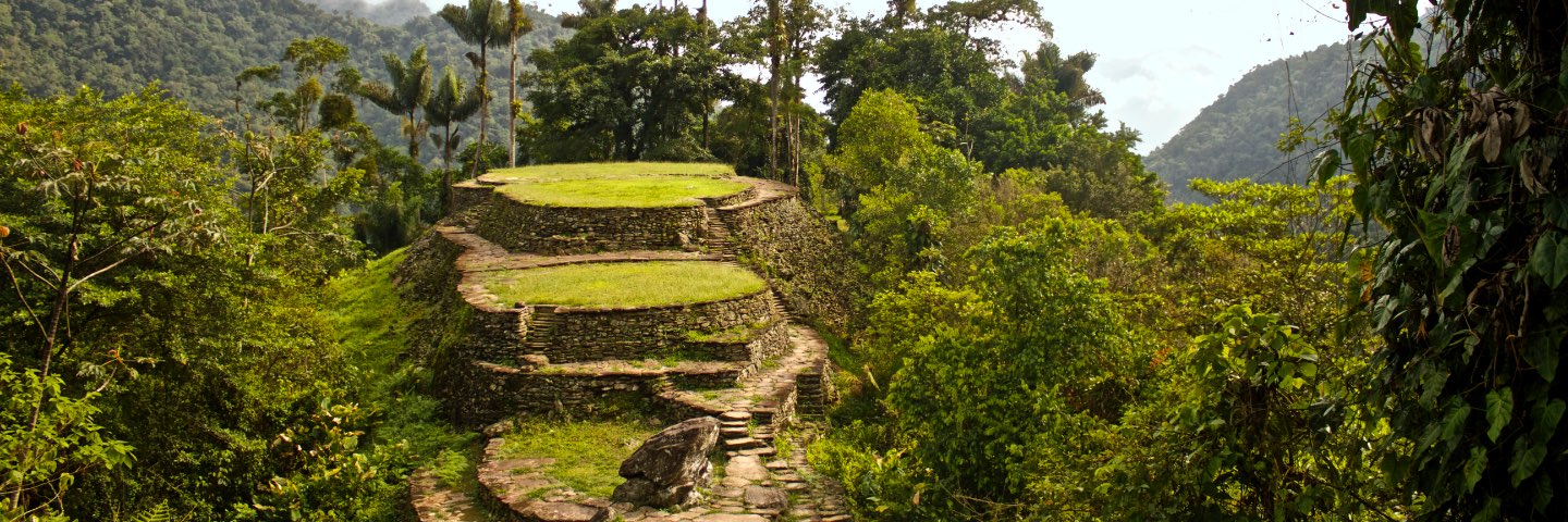 Steps to ruins in a mountainous region surrounded by green landscape.