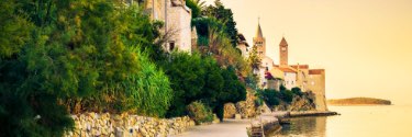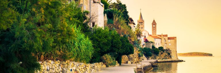 View of Croatian town from walkway along the coast during sunset.
