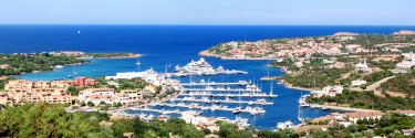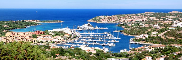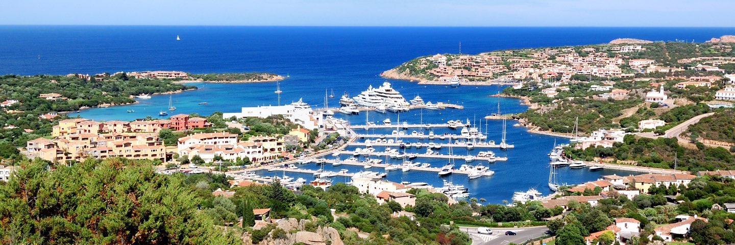Top view of seaside town and clear water harbor on a sunny day.