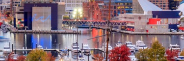 View of Inner Harbor area in large city downtown white sun sets.