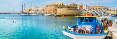 Close view of old town and turquoise waters harbor with colorful fishing boat.