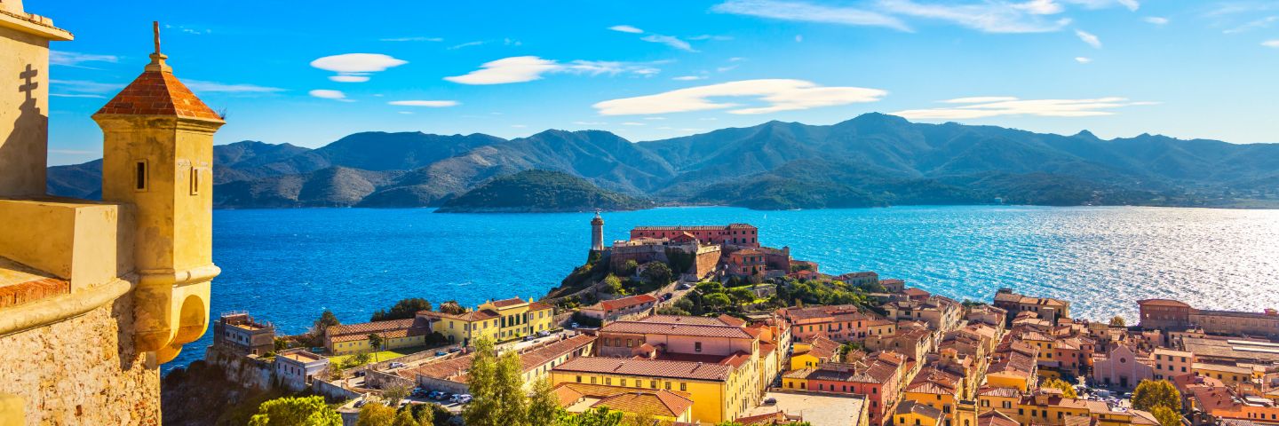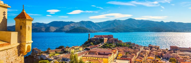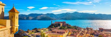 An aerial view of Portoferraio, Elba, looking towards the water and rolling mountains beyond.