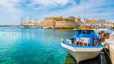 Gallipoli means ‘Beautiful City’ in Greek—and this gorgeous little town on the Salento Peninsula certainly lives up to its name. Surrounded by water and accessible only by sea or via a 16th century bridge, the town’s historic heart sits on a small island that juts out into the Ionian Sea. This is a place that displays its proud seafaring heritage at every turn, and you’ll see fishermen fixing their nets at the harbor and the freshest seafood dishes adorning the menus of the Old Town. Spend the day soaking up some sun at Baia Verde beach, or head north to enjoy coastal hikes at the Parco Regionale Porto Selvaggio. At the end of the day, treat yourself to some of Gallipoli’s famous red prawns and spumone layered ice cream.