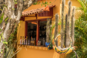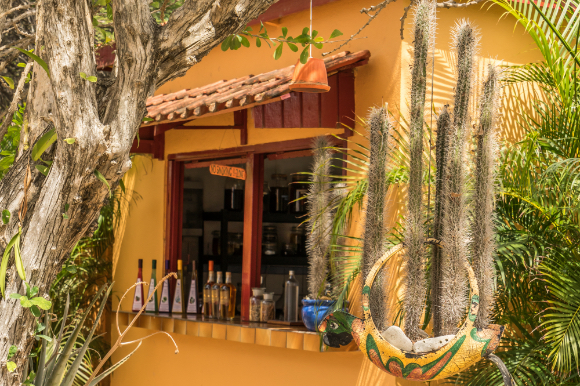 A tropical bar decorated with plants.