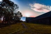 A green meadow in a country area, with a small path, and trees at dawn lights.