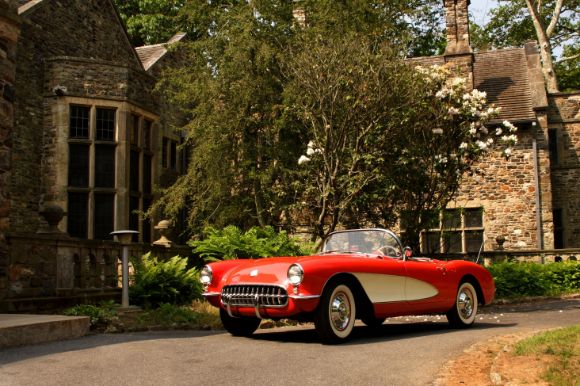 A red vintage car parked in the driveway of a stone mansion.