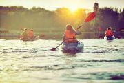 A group of kayakers paddling on a body of water into the sunset.