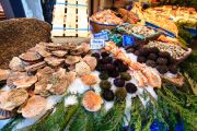 Clams, urchins, shrimp and other seafood on display at a market.