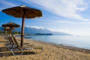 Beach chairs look out at the transparent sea with mountains in the distance.