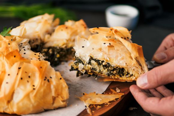 A close-up look of someone taking a slice of spanakopita.