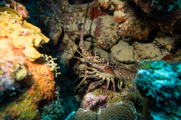 In the foreground a lobster in the transparent seabed.