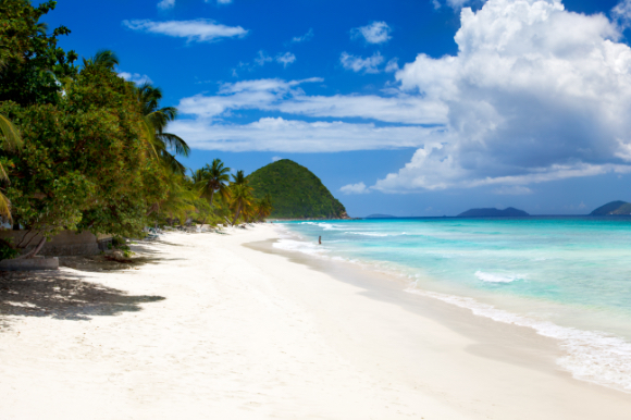 Tropical beach with clear blue water, trees, and white sand.