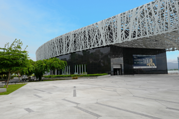 View of the modern museum with a nearby park.