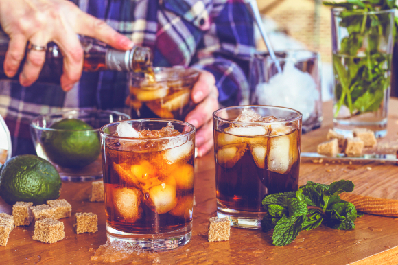 Man making cocktails on a wooden table with ice and limes.