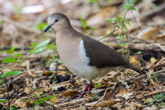 The foreground of a grey and brown pigeon.
