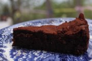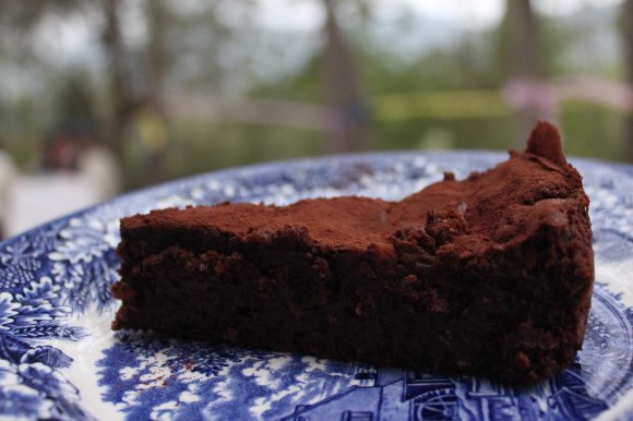 The foreground of a slice of chocolate cake.