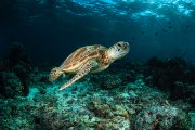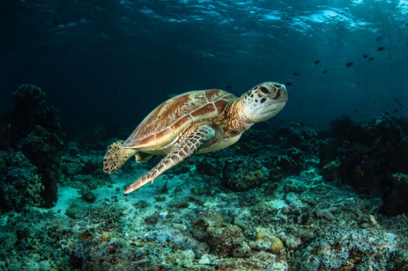The foreground of a sea turtle swimming in the sea.