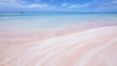 Pink sand beach with waves washing ashore.