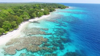 Shades of blue water lead up to a white sand beach with lush greenery.