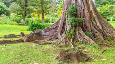 The trunk of a large old tree, surrounded by green grass and leaves.